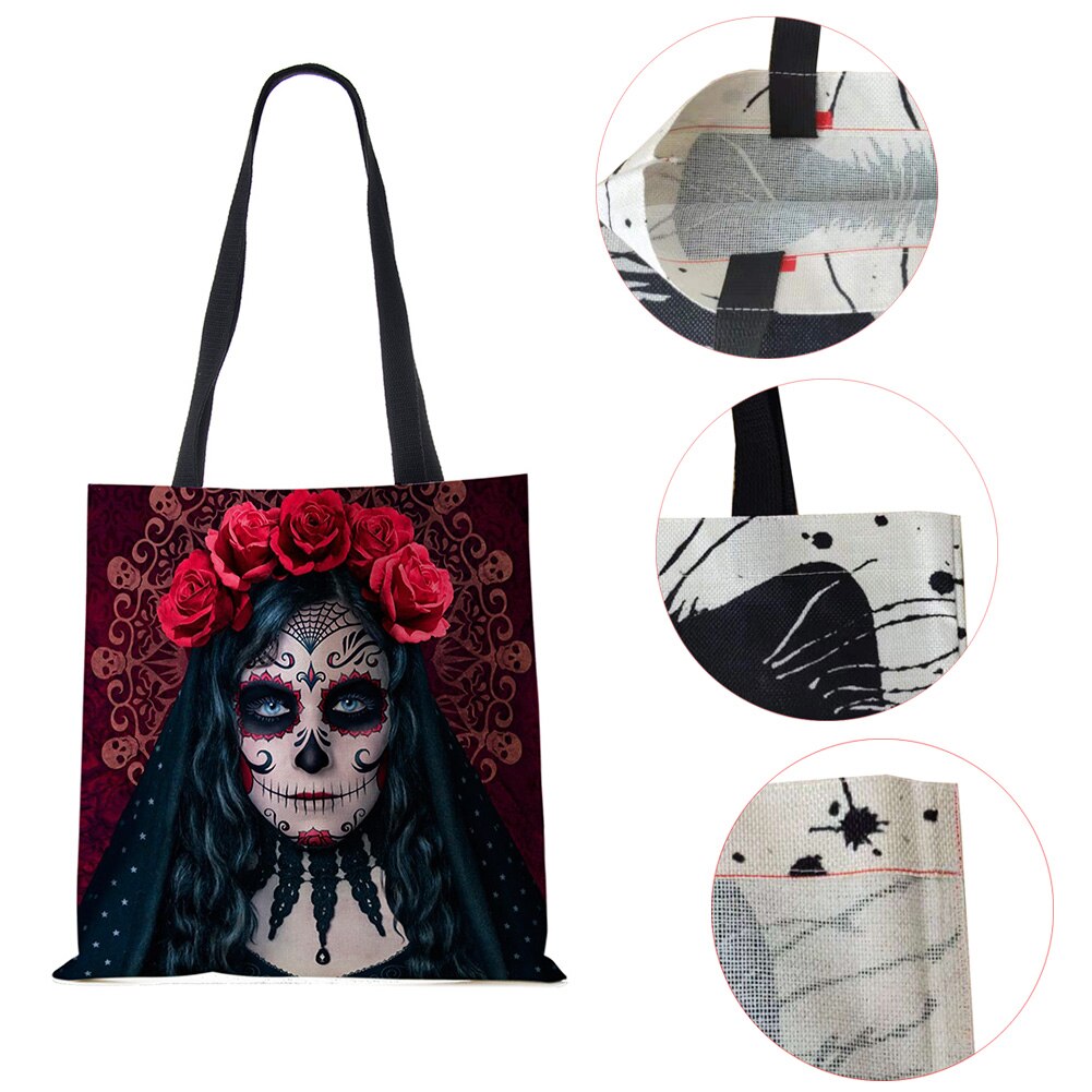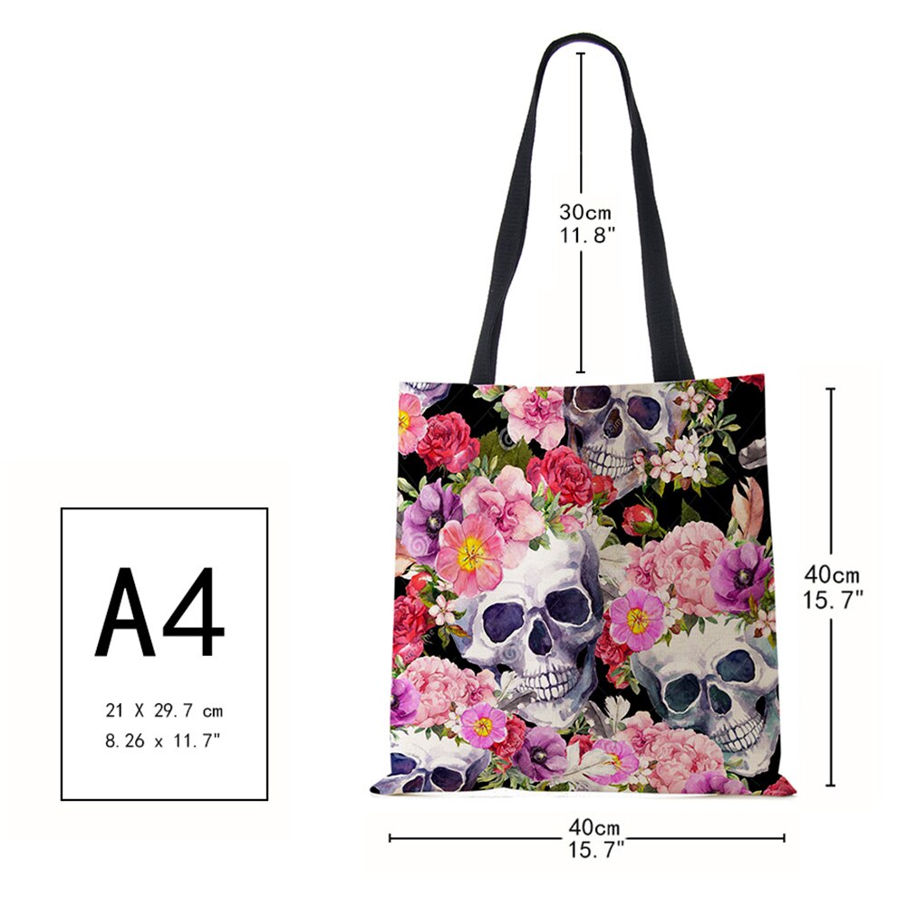 Day of the Dead Floral Skull Print Tote Bag Handbags for Women Halloween Sugar Skull Girl Shoulder Bags Large CapacityItem Name: Tote BagMaterial: Linen PolyesterSize: 40×40 CM/15.7×15.7 inchesDesign: as picture showPacking List: 1* Tote BagFeatures:*Eco friendly high quality linen material.*Novelty and beautiful Design.Eco-friendly imported ink printing and dyeing.No harm to health .*Foldable,Practical and reusable . Very useful when go out and environment friendly*Used as 1) Tote Bag (personalized casual tote bag for daily use. both for fashion women & men.) 2) Shopping Bag (foldable & reusable&eco friendly)3) Storage Bag (home storage for clothes,toy, books,bedding,sundries ,etc) *We support Drop Ship , Wholesale and Personal Customized , welcome to contact us.Friendly Notice:1) All tote bags are handmade, there may be 1-2cm deviation exist. 2) Actual color may be slight difference between the monitor display picture because of the light brightness.