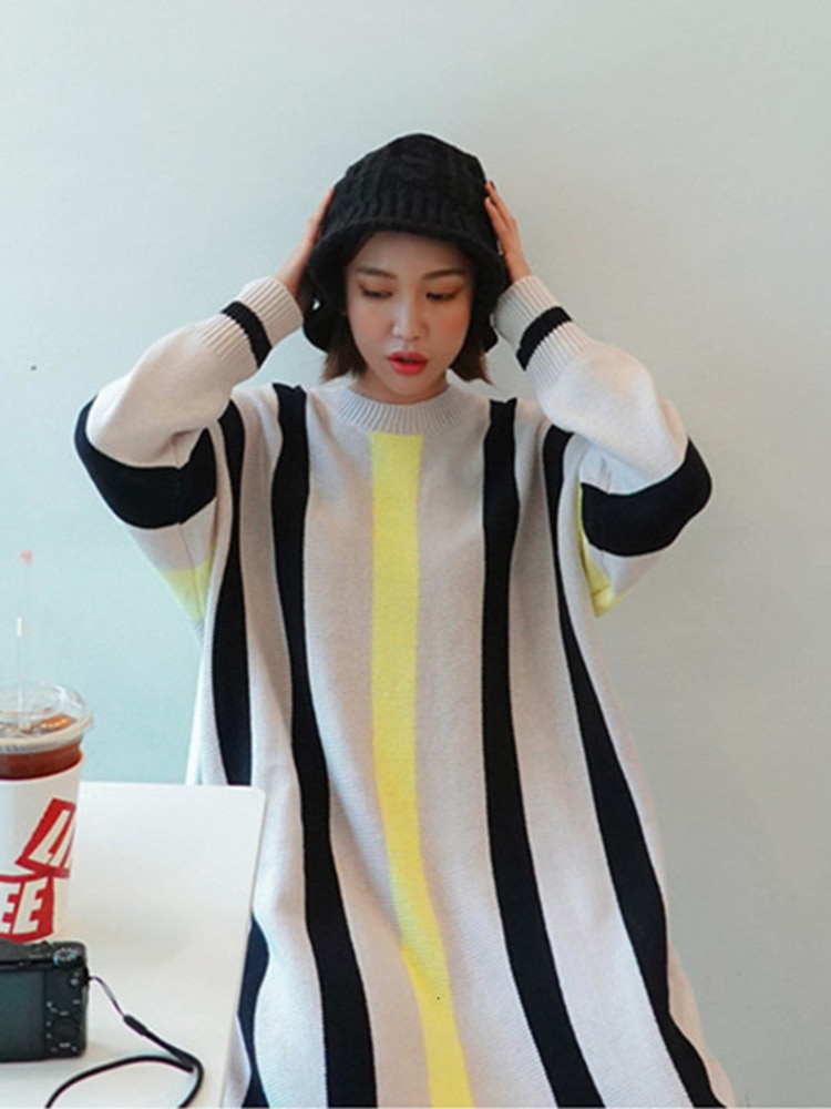 SHENGPAIAE 2023 Autumn New Large Size Long Sweater Dress Women Robe Loose Striped Knitted Sweater Casual Knit Dresses 5W910