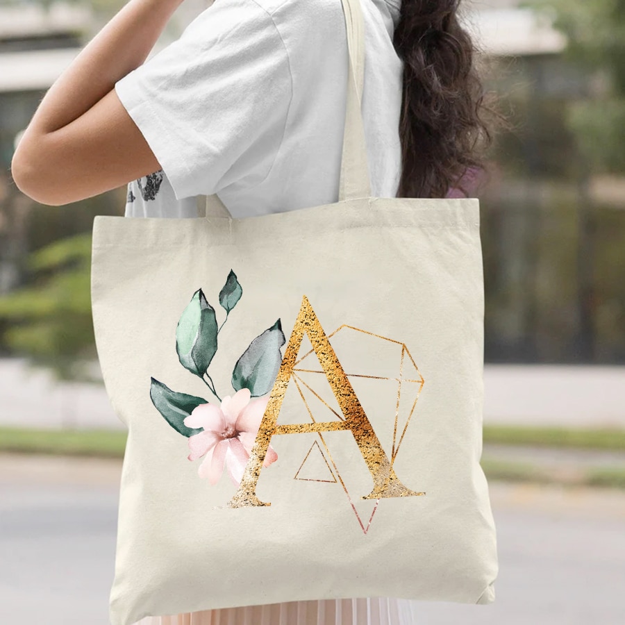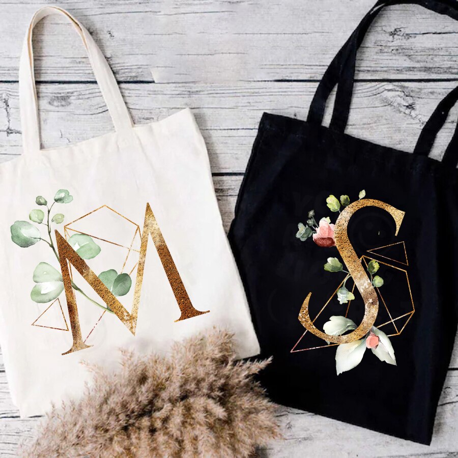 Women Black Shopping Bag Commuter Pink Flower Letters Initial Name Pattern Printing Series Canvas Shoulder Bag Tote Bag Reusable