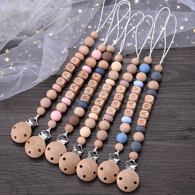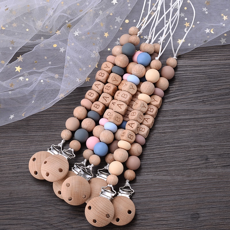 New Wooden Beech Letter Beads Baby Pacifier Clips Silicone Beads Anti-Lost Pacifier Chain for Dummy Nipple Holder