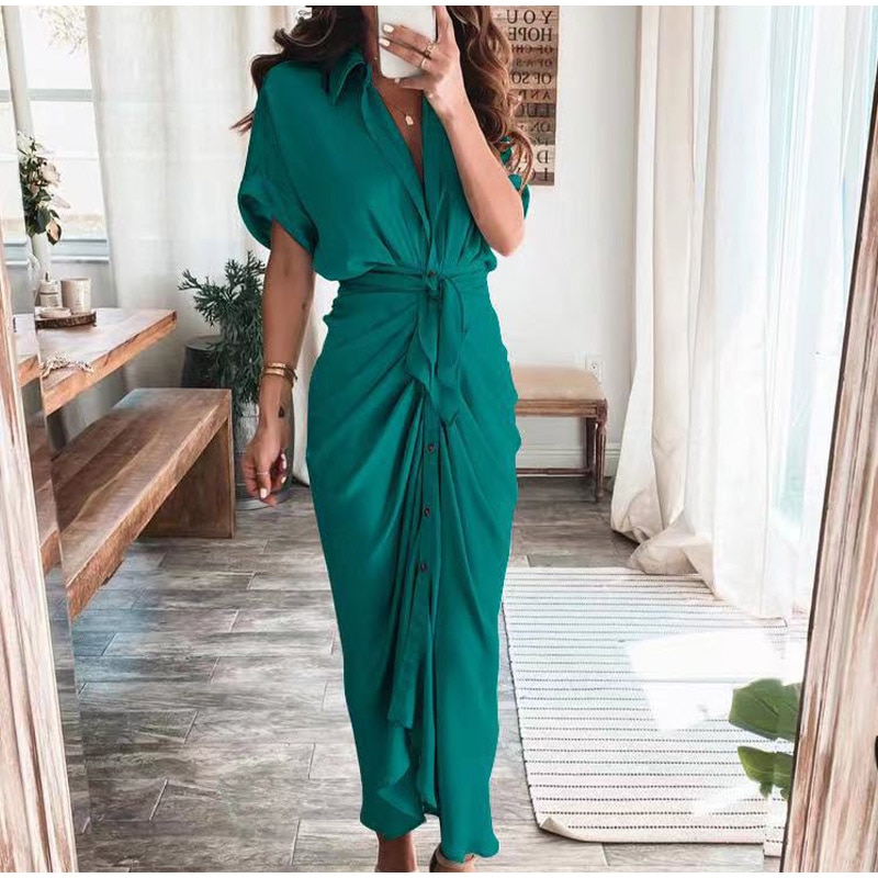 Women Elegant Shirt Dress Summer Fashion Printed Button Ruched Bandage Long Dresses Female Solid V Neck Beach Dress Casual Robe