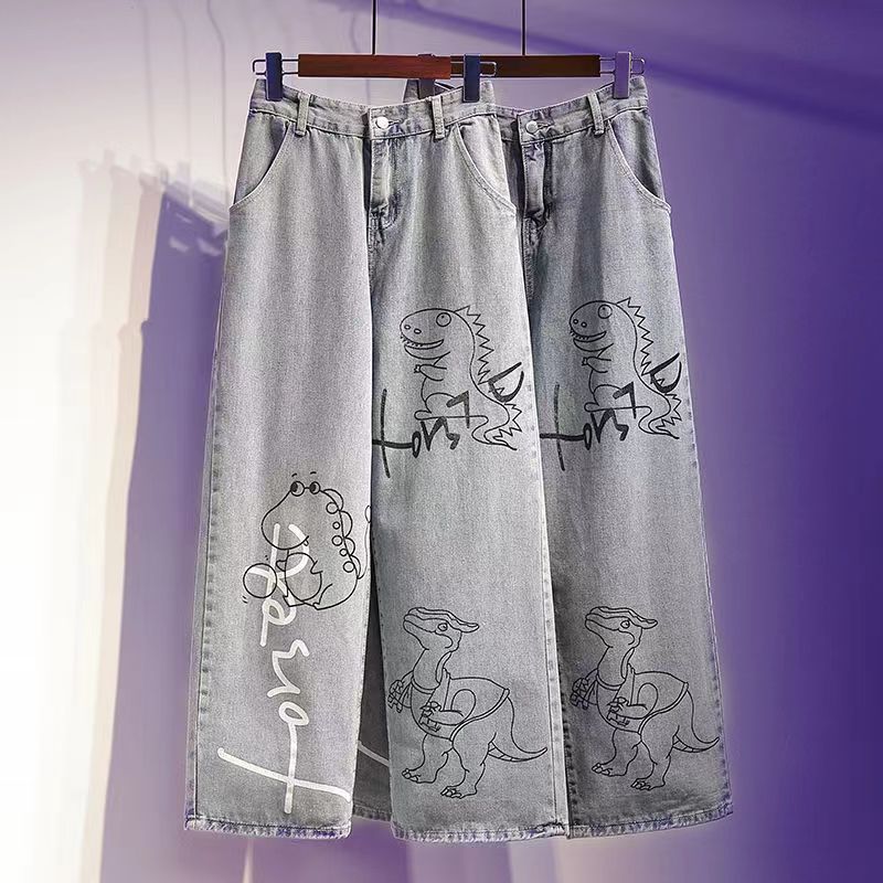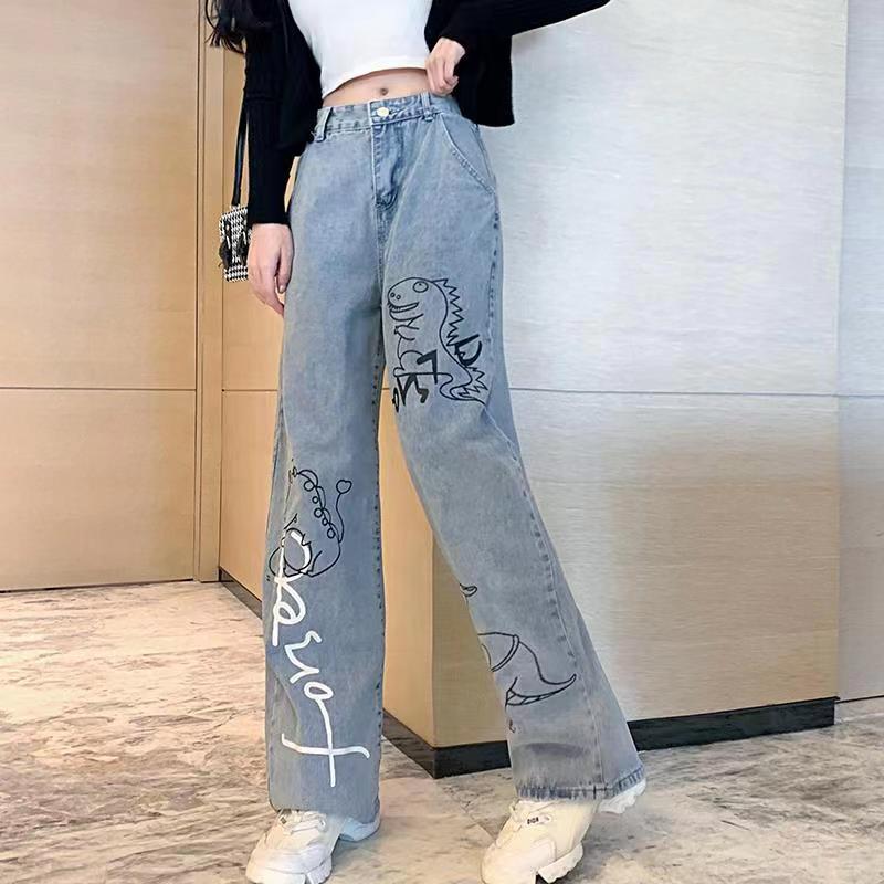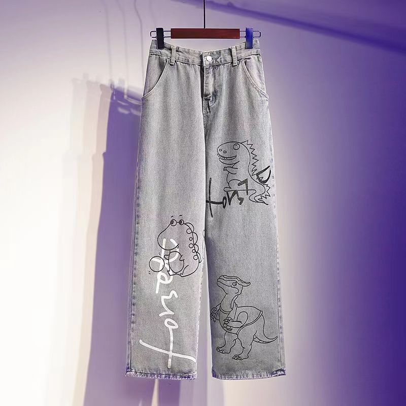Dinosaur Print Jeans Girl Boyfriend Straight Leg Pants Boy Pants Harajuku Kawaii Jeans High Waist Loose Cool Autumn Jeans Girl