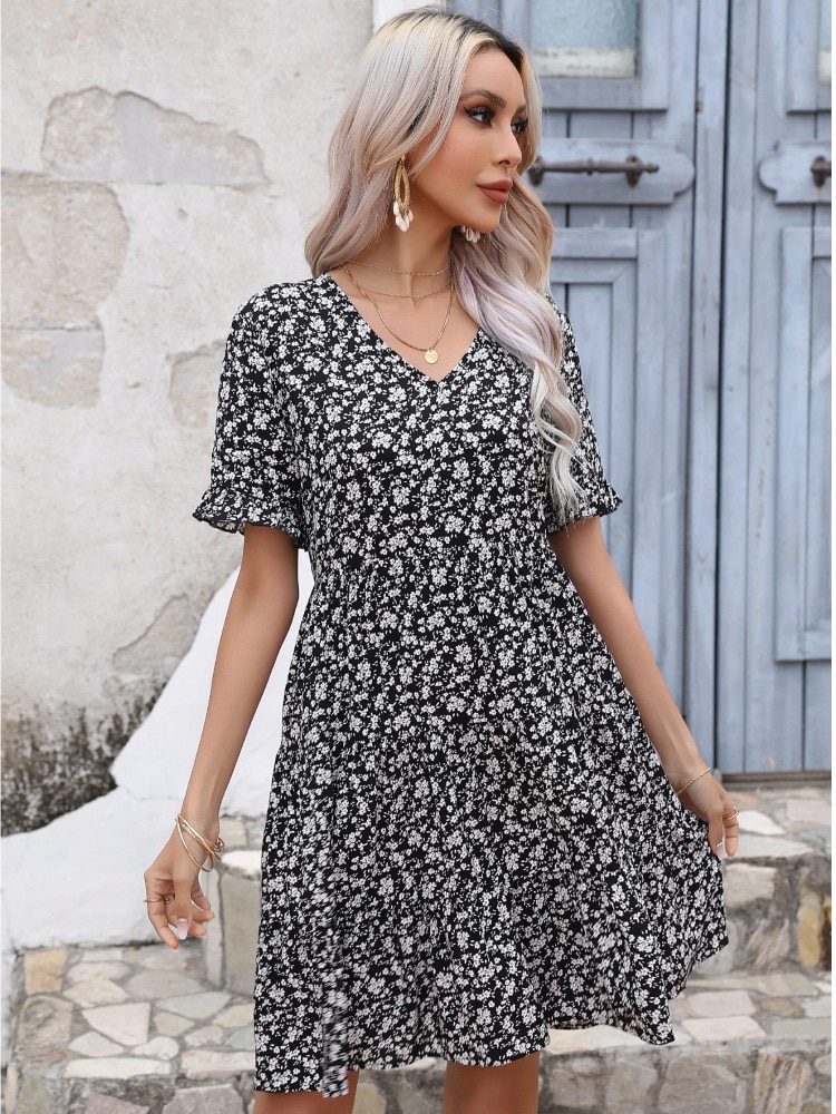 Ladies Vintage Summer Dress Floral Print Loose Dress Women Casual V-neck Ruffles Mini Dress 2023 Fashion Beach Sundress Vestidos