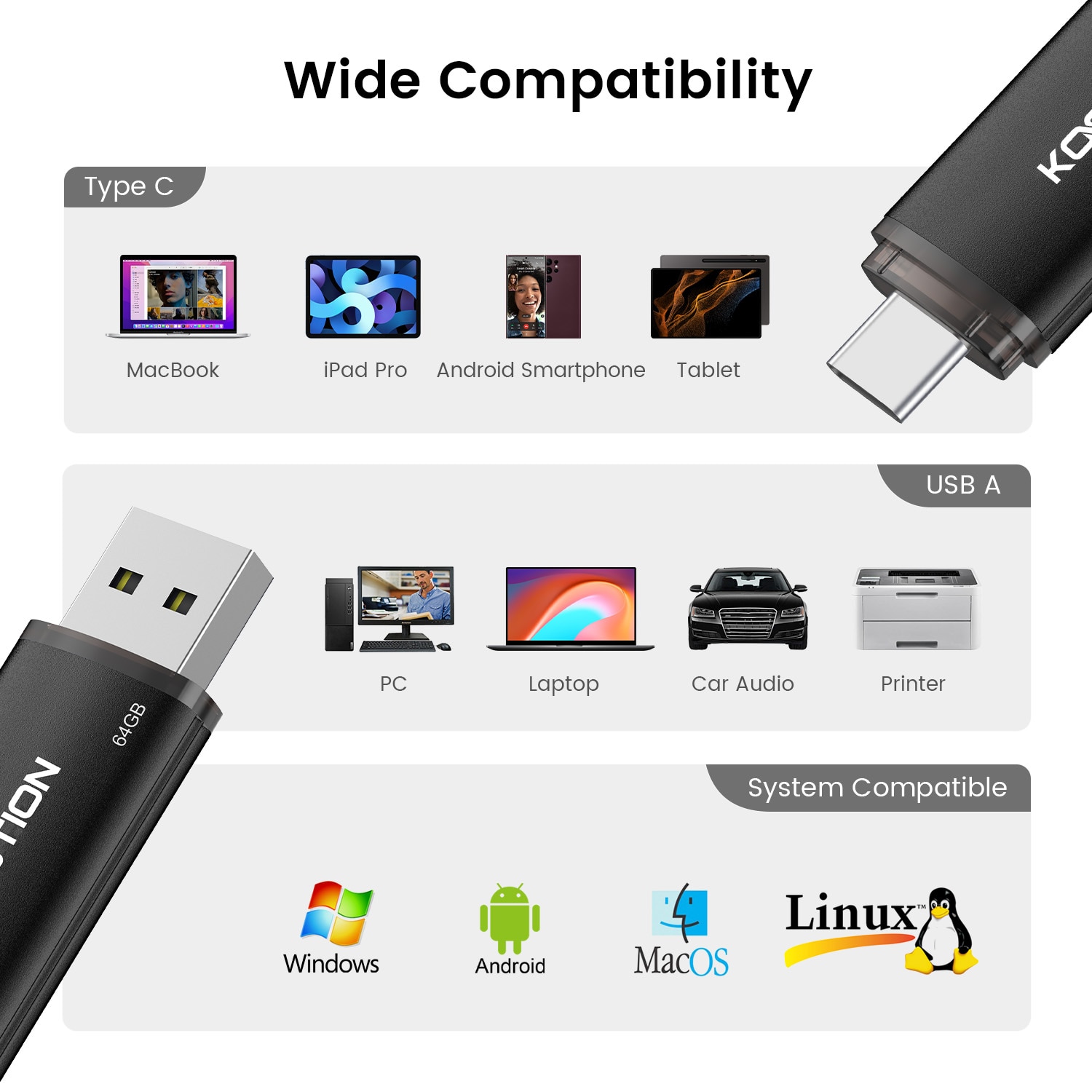 [Wide Use] This thumb drive works with Windows, Android, Linux, and Mac OS. Perfect for use with computers, laptops, MacBook, iPad Pro, OTG-enabled Android smartphones, and tablets.