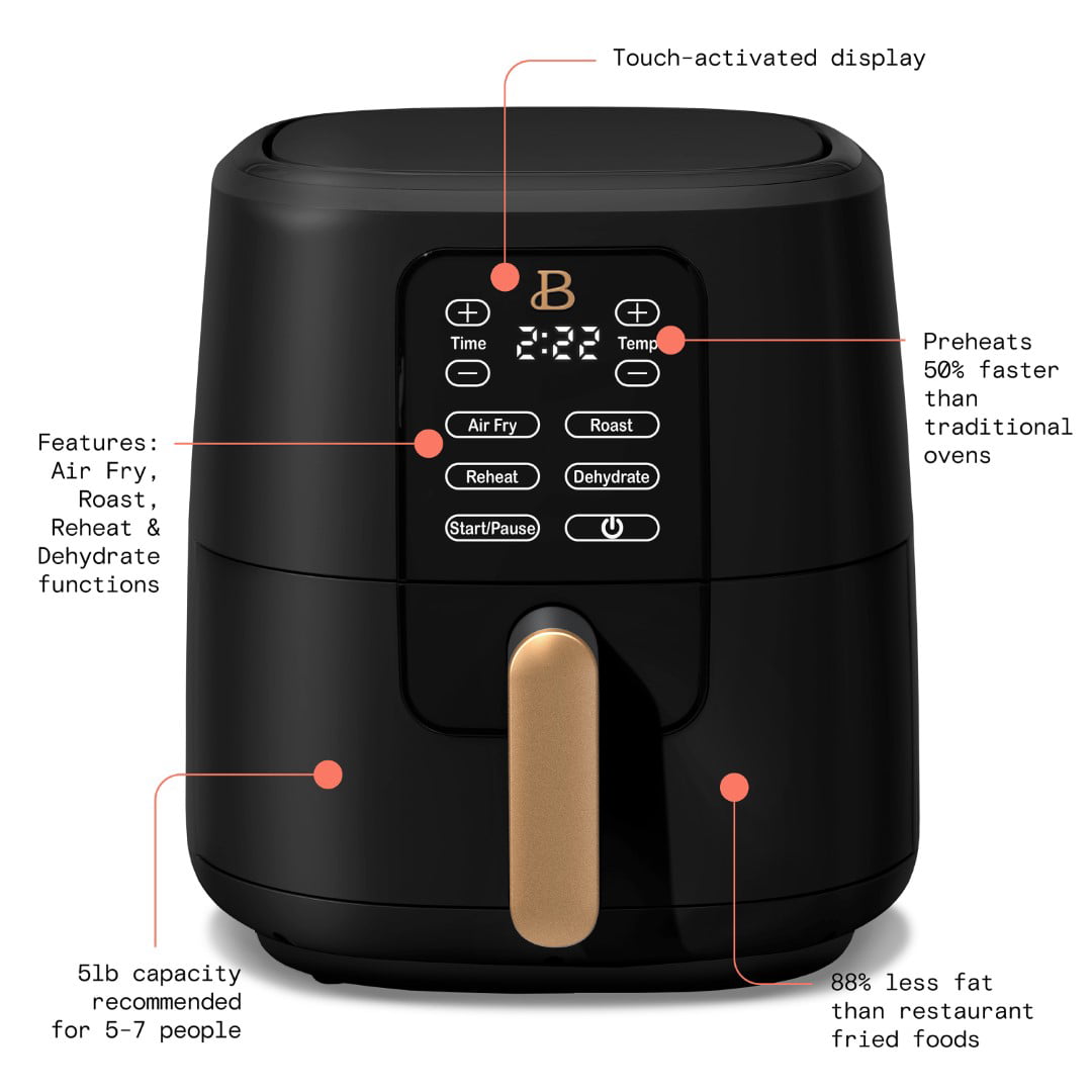 Easy meals for busy weeknights. Air fry, roast, reheat or dehydrate your favorite meals with the Beautiful 6QT Digital Air Fryer with Touch Activated Display. Thoughtfully designed with sleek touch-activated illumination and our signature gold accents, the Beautiful Air Fryer preheats food up to 50% faster than a traditional oven with a 5lb food capacity ideal for serving 5-7 people. Created by Drew Barrymore, Beautiful Kitchenware™ combines elegant design, contemporary colors and modern silhouettes for high-performance appliances that look beautiful on your kitchen counter.
