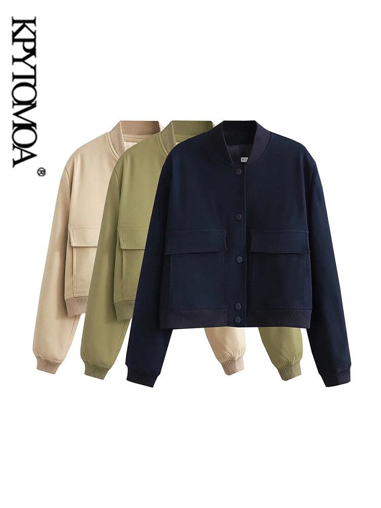 KPYTOMOA Women Fashion With Pockets Loose Bomber Jacket Coat Vintage Long Sleeve Front Button Female Outerwear Chic Tops