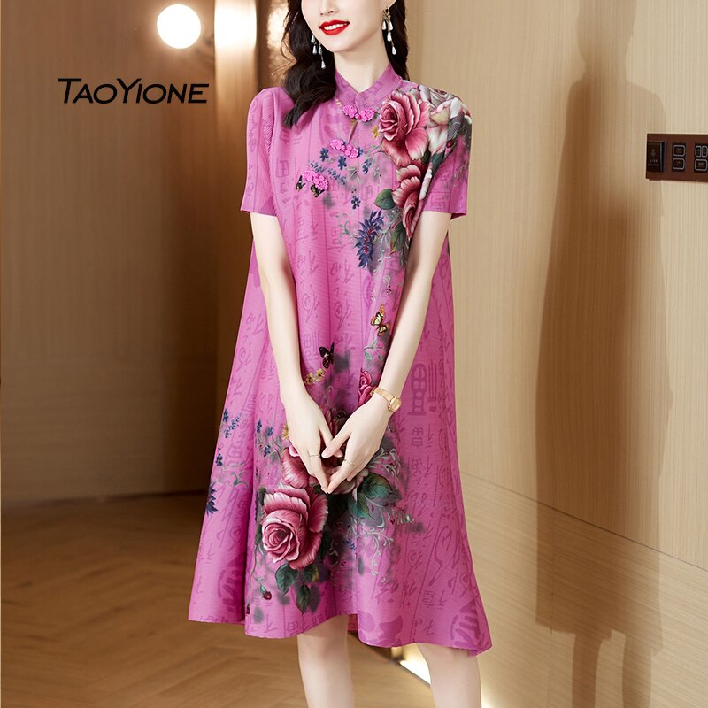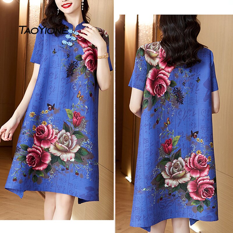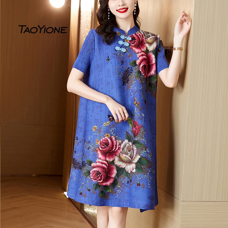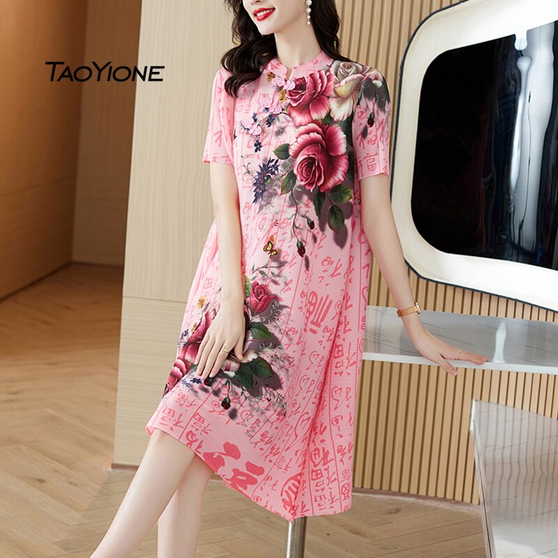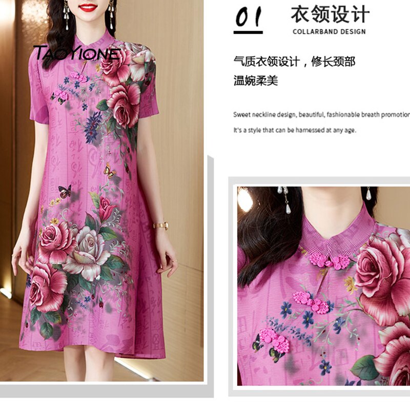 Dresses For Women 2023 Korean Fashion Summer Vintage Silk Printed Dress Women Short Sleeve Sundress Women Vestidos Lady Dress