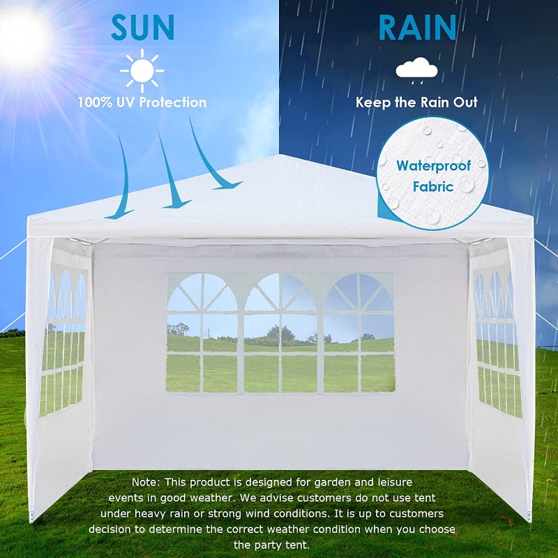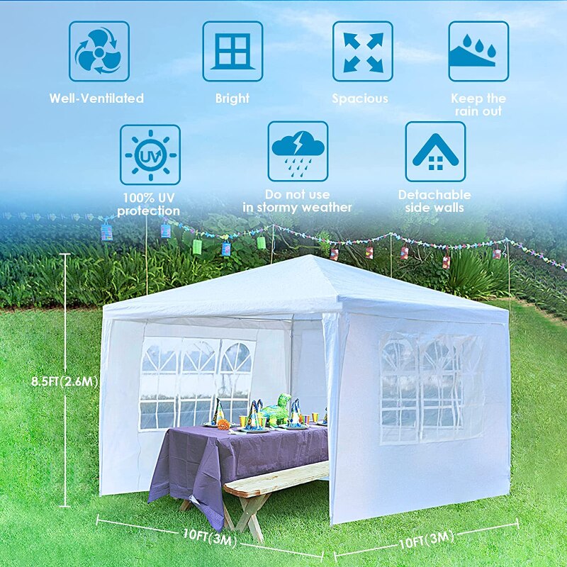 LARGE SPACE: 10x10 feet with 3 sidewalls  White Wedding Party Tent provides 100 square feet of shade coverage, 6 to 10 people at the same time for any outdoor events.