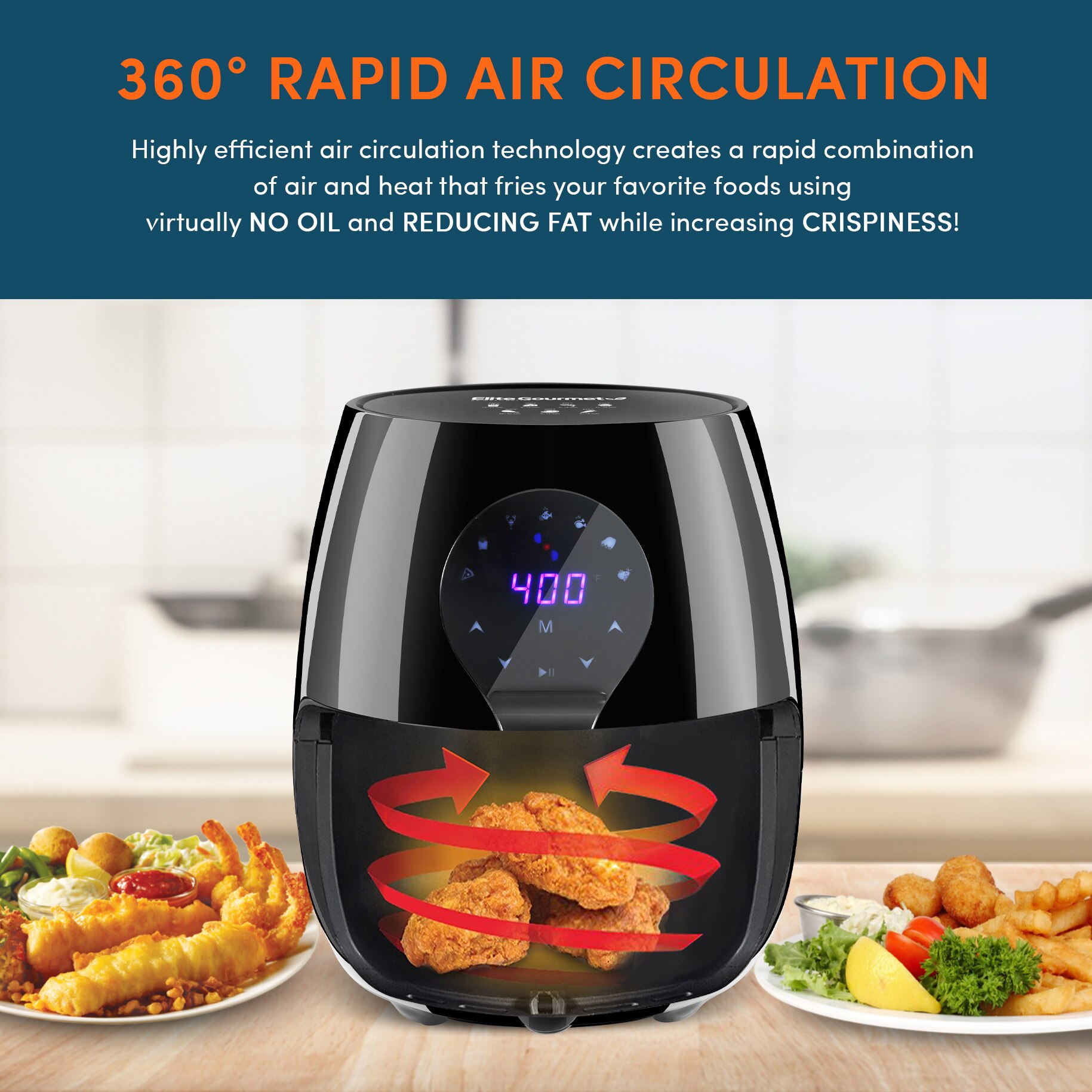 Oil-Free 5.3 Qt. Digita l Air Fryer can handle a variety of cooking tasks. Large 5.3 quart capacity and digita l controls make this Air Fryer & Multi-cooker a must for any kitchen. With easy to use digita l temperature and timer controls, you can easily fry, cook, or even bake your favorite meals and snacks for the whole family! Not only can you cook foods without the mess of oil but you can cook faster which saves you time and energy.